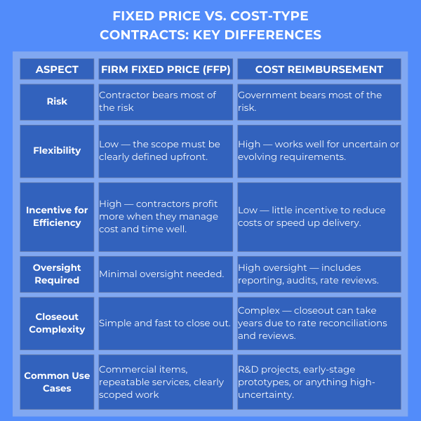 For contractors, this hits where it counts: pricing, profit, cash flow, and your shot at winning. Price an FFP job too low, and you’re working for free. Price a cost-type job too high, and you lose to someone who got it right.